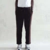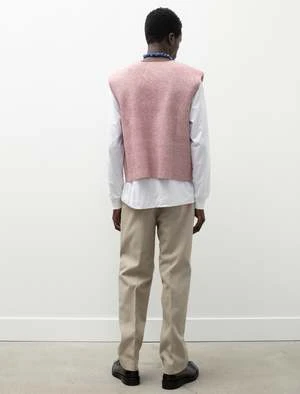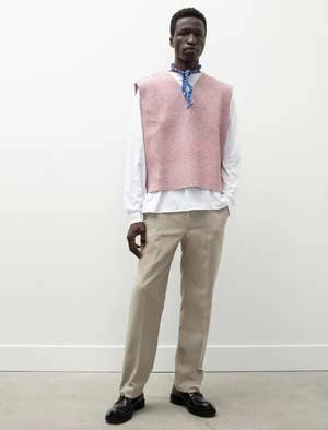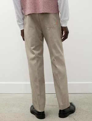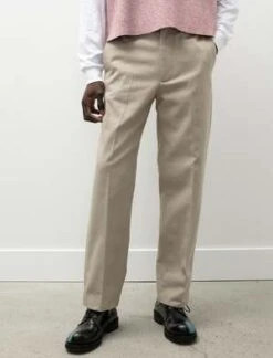 Flat front, trousers with a slim straight leg, cut from a mid weight textured cotton twill in a medium beige. Feature front slash pockets, a single rear patch pocket at the right side, a long rise, and six belt loops at the waist. Leg is creased lending a sense of formality to an otherwise casual seeming fabric. Finished with a blind hem that can be let out if added length is desired.