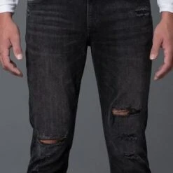 – 5-pocket styling, 4-button fly. Shredded holes at the knees, upper thigh. Raw edge hems.