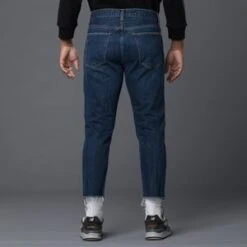 – 5-pocket styling, 4-button fly. Raw edge hems.