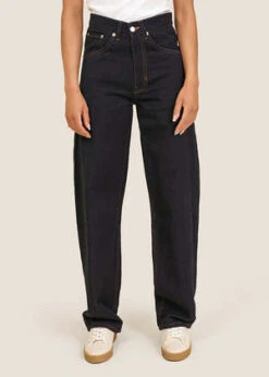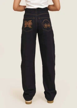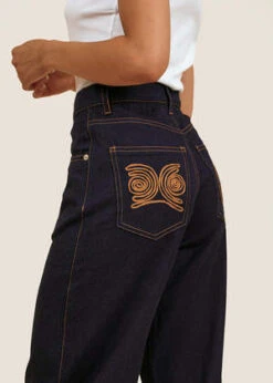 Soft and comfortable 90’s cut jeans in an indigo blue wash with a relaxed, subtle bow leg that makes for a more flattering fall. Features a dipped waist, belt loops, 5 pocket styling and zip and button closure at front. The contrast spiral embroidery on the back pockets is iconography of spirals in the goldwork of the Urab region in the North of the Colombian Pacific Coast.