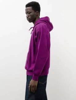 A relaxed fitting, slightly cropped, hooded sweatshirt cut from a super dense cotton blend in a vibrant violet. Features a small, almost square, front kangaroo pocket and rib knit side panels. Extended tonal cord drawstring at the hood with grommet eyelets. Side panels attached with flat locked seams fro minimal seam wear, cover stitched seams throughout to flatten internal seam allowance and reduce abrasion.