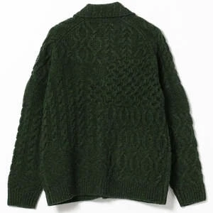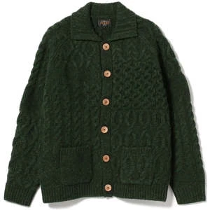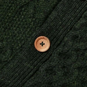 Aran cable-knit wool cardigan featuring brown, wool, cable knit, classic collar, front wooden button fastening and long raglan sleeves.