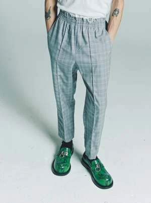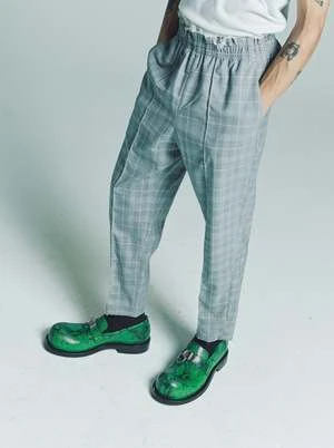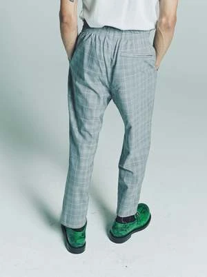 Ankle-length tapered cropped pants. Relaxed fit. Elastic waist. Slip side pockets. Pin tuck on front. Irregular top stitching. Raw details at the edges.