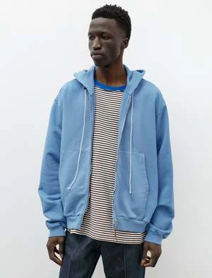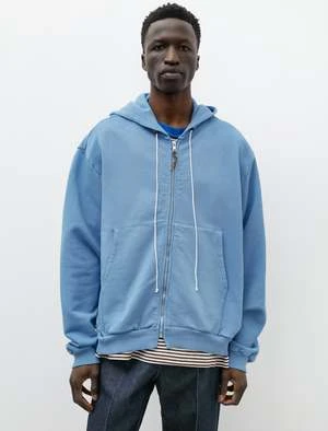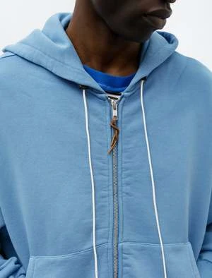 An oversized, cropped, zip front hoodie cut from a heavy loopback fleece in a powdery blue. Features a YKK zipper with a custom brown wire zipper pull, front patch pockets, and cord drawstrings at the hood with push toggles for easy cinching. The signature deconstructed finishing presents as exposed raw edges at hem and cuff ribbing details. Neckline is taped in colour matched cotton jersey for a low profile finish that reduces abrasion along the neck.