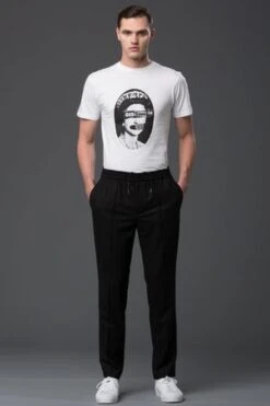DEVEAUX NEW YORK continues to define American Luxury in menswear with their Fall collection. The Pintuck Trousers combines the formal with casualwear, cutting a modern trouser in Italian stretch black wool flannel. A hybrid of modern function and elevated design, the trousers have an elasticated waistband, and pintuck seams, to provide a slim and modern cut which bridges the gap between dressy and casual. Worn with the Thaddeus O’Neil God Save the Queen Tee.