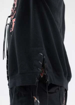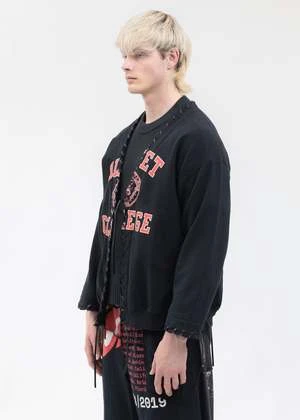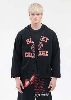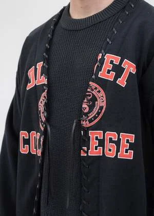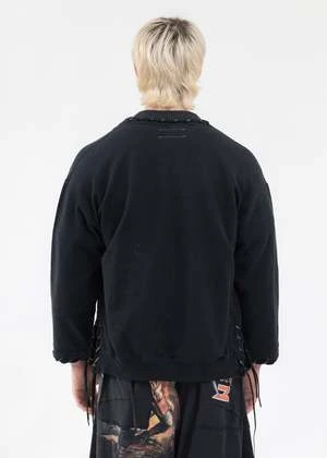 1 of 1 reconstructed vintage college sweatshirt sweater, featuring vintage college sweaters that have been deconstructed and reconstructed into a relaxed fitting sweater held together with leather tape stitching and tie strings to attach it in the middle.