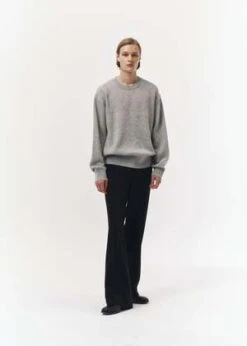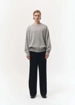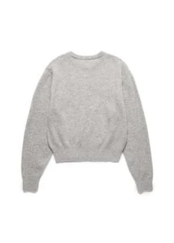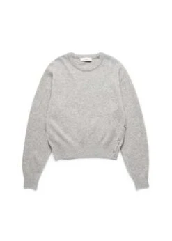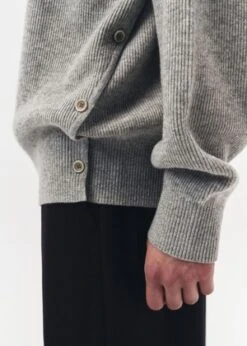 Ribbed knit runs throughout the bodice of this comfortable wool-blend knit with slight stretch and soft character. A cropped, drop-shoulder fit is highlighted by a discreet button-closure running down the left side seam.