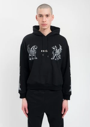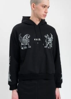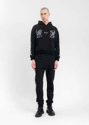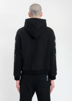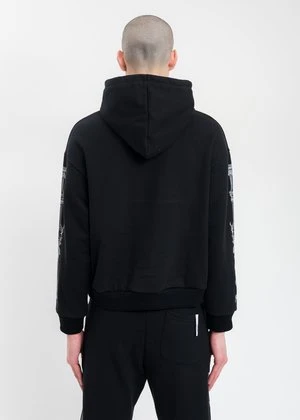 Black cotton hoodie. Features white graphics across the chest and along both sleeves. White logo embroidery centered at the chest. Finished with tonal stitching, drawstring, and rib knit cuffs and hem.