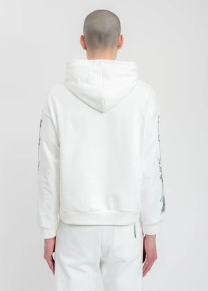 White cotton hoodie. Features black graphics across the chest and along both sleeves. Black logo embroidery centered at the chest. Finished with tonal stitching, drawstrings, and rib knit cuffs and hem.