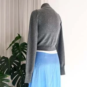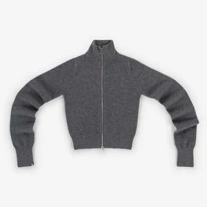 Sporty cardigan that features a high collar and a zipper that opens both ways. It has a very tight fit and extra long sleeves.