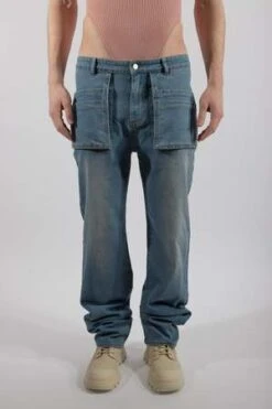 Low-rise and oversized jeans crafted with premium cotton. A relaxed fit that bunches at the bottom. Featuring six pockets: four smock-like pouches at the front and two regular pockets at the back.