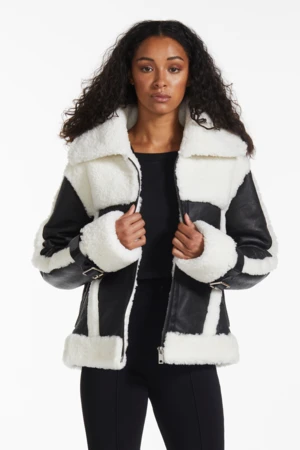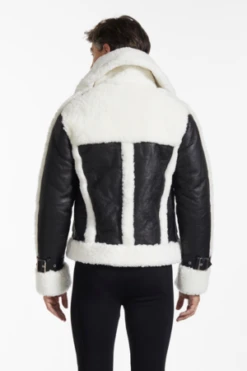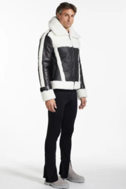 This seasons trophy jacket. Crafted with pure sheepskin and black leather trims, this weather-proof piece is inspired by aviator and collegiate jackets to simultaneously provide functionality and style.
