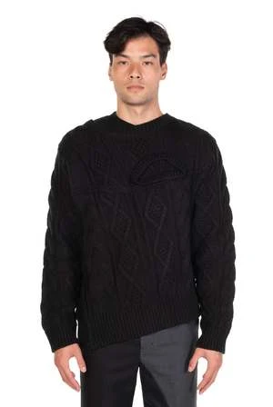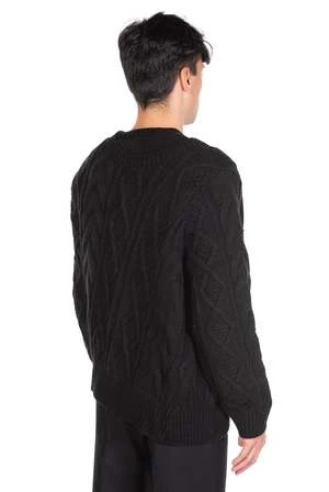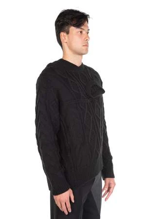Black cable knit jumper. Long sleeves. Round neck. Signature deconstructed design throughout. Double collar design. Thick knit with soft touch.