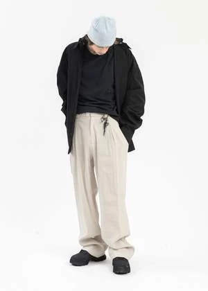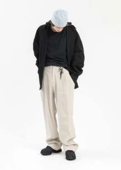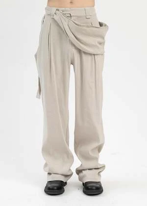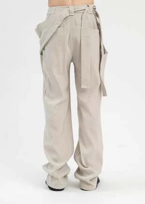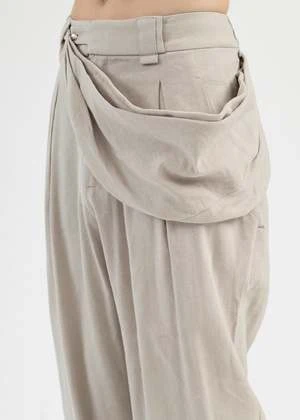 Silver button pants in beige, from Hyein Seo. Features a paneled construction with an integrated waist bag, darting at the thighs, and tonal stitching throughout. Sculpted 925 silver button at the waist. Finished with tonal stitching throughout.