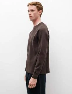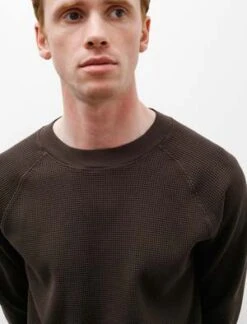 A relaxed fitting, flat hemmed, long sleeve thermal tee cut from a super dense cotton waffle jersey with a crisp dry hand in a muted, dusty shade of brown. Raglan sleeve construction creates an elegantly draped silhouette that falls nicely from the shoulder while simultaneously removing excessive bulk from the armhole. The elegant relaxed silhouette is preserved with an overlocked, raw hem that will tend to sit away from the body in place of clinging. Constructed with cover stitched reinforcement throughout all seams to both flatten internal seam allowance and increase overall durability; ribbed neckline.