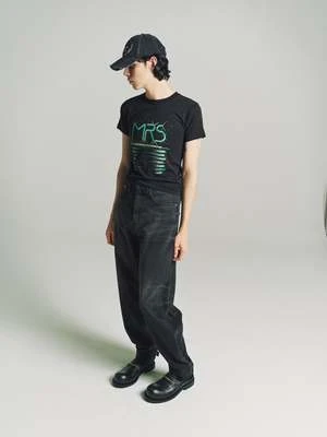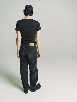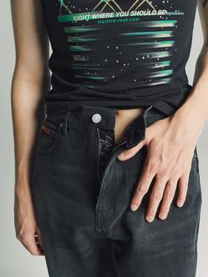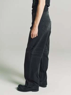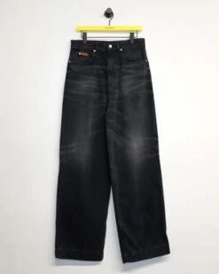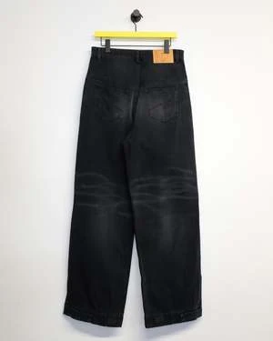 A new silhouette for AW23, these high waisted, wide leg jeans in a dark black wash have a secret message embroidered next to the zip fly. Featuring front button closure, five pockets, belt loops, jacron and adjustable velcro straps at the hem.