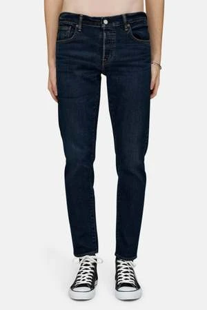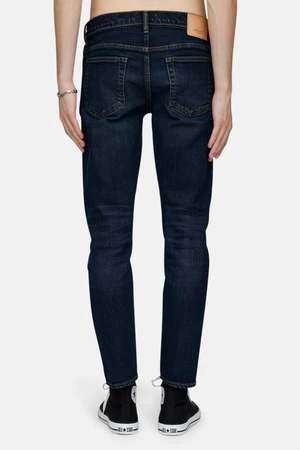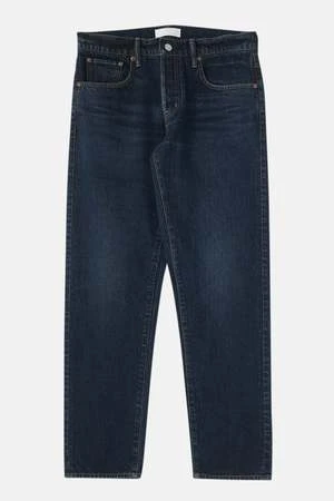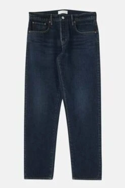 – Dark wash tapered jeans with slight fading