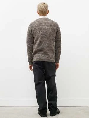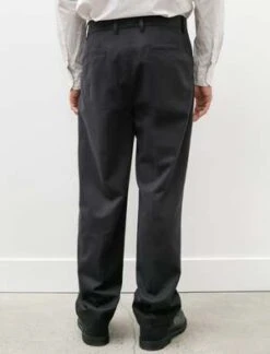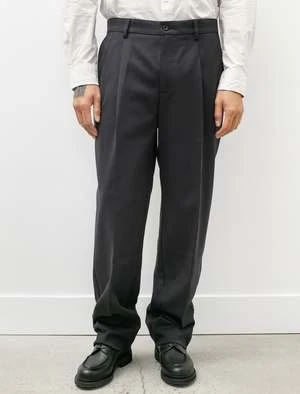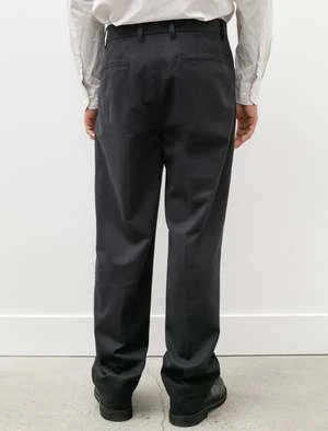 Mid rise, relaxed fitting trousers with a slight taper cut from a blended stretch cotton/wool twill in black. Feature a zip fly with a two-point button closure, dual pleats at the waistline, front slash pockets, and rear welt pockets. The gentle taper from the knee to hem offers a composed formal silhouette that is nicely contrasted by the textural nature of the twill, a traditionally utilitarian fabric. Finished with a crease running the length of the leg and a blind stitched hem creating a sense of easy elegance that is easy to dress up or down.