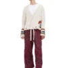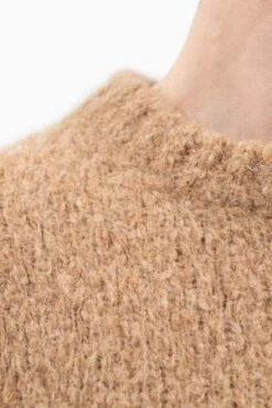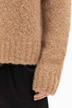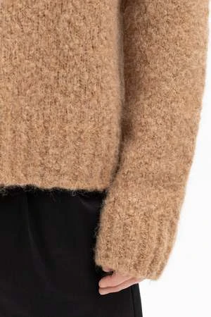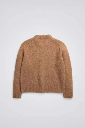 A sweater made of an alpaca/polyamide blend yarn with a flam structure. The style is knitted in plain jersey and features a ribbed neck trim, cuff and hem. Alpaca wool is luxuriously soft, hypoallergenic and unique in its insulation properties. It is quickly becoming one of the worlds most renowned sustainable fibres, as alpacas produce more fleece than sheep and they have more effective eating and drinking habits than other grazing animals, which also reduces the environmental impact.