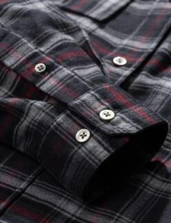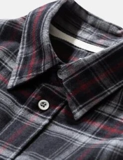 A classic button-down shirt made from a light flannel in a classic check design, brushed to add subtle texture and a soft handfeel. Features include mother of pearl buttons and one button-closure chest pocket. Higher top button on placket, allowing the top button to be undone while still maintaining a clean look. Product Details: