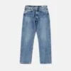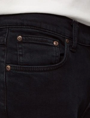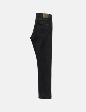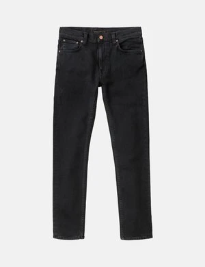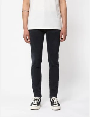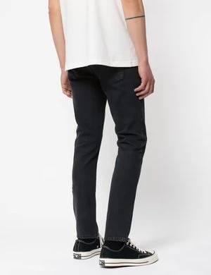 The Lean Dean Jeans in the Slim Fit Black Skies colour from Nudie Jeans are a slim fit stretch jean with a tapered leg made from an indigo-blue denim that has been garment dyed black and gently washed.