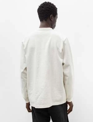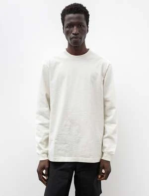 A generous fitting long sleeve t-shirt cut from Paa’s signature high gauge cotton jersey with a sturdy dry hand in a soft off-white. Features a slight drop shoulder and a boxy cut through the chest to create controlled volume at the side and sleeve; ribbing at the sleeve creates a subtle bloused effect, emphasizing their extended length. Finished with a ribbed neckline and shoulder-to-shoulder taping at the back neck for improved comfort at a region of frequent abrasion.