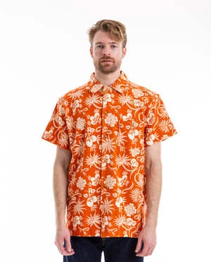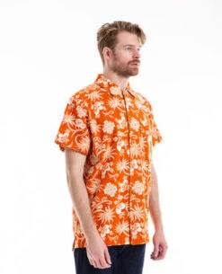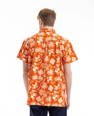 Wayside Knit Shirt in lava red by Pendleton. Warm-weather comfort in a soft, breathable cotton knit shirt featuring an exclusive Pendleton tropical print. One button-through chest pocket, high/low hem with side vents, back hanging loop.