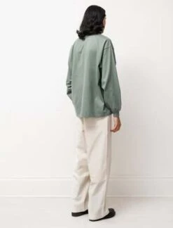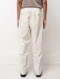 Wide leg, straight cut trousers made from a British natural cotton with a nepped texture that has been washed to create a unique wrinkled effect. Featuring workwear-inspired side pockets and two contrasting back pockets.