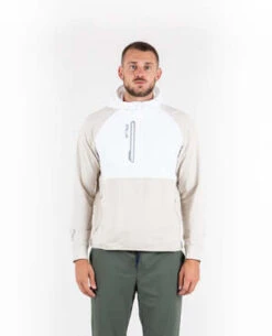 Stretch half zip hoodie in sand & white by RLX Ralph Lauren. Constructed from a highly breathable, stretch, cotton blend, fabric that offers exceptional moisture-wicking properties and a soft touch feel. Raglan sleeve construction. Brushed inner for added warmth. Elasticated binding to hem and hood for a secure fit. Welt chest pocket and contrast zipper.