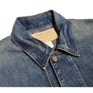 Lightweight jacket made from denim that is woven in Japan. Medium indigo wash with a light rinse and tint inspired by a ’20s denim chore jacket. Vintage-inspired fit. Dropped shoulders and a slightly tapered waist.
