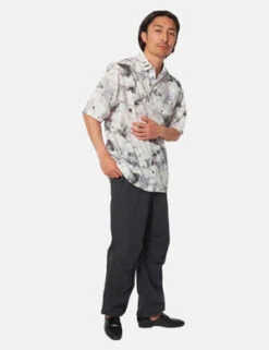 Featuring a marbled print, buttoned collar, right chest pocket, and drawcord at the hem.