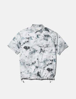 Featuring a marbled print, buttoned collar, right chest pocket, and drawcord at the hem.