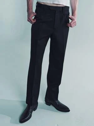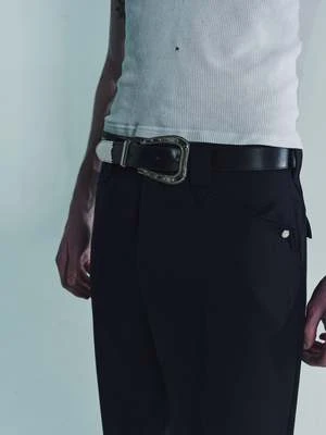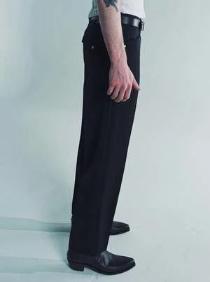 Western trouser pants with front pockets and belt loops in wool satin material. The silhouette is deep in the crotch and slightly tapered, with pearl buttons on the cutting of the front pockets, belt loops, and various other western details. The front is lined with cupro for smoothness. There are also jackets and shirts made of the same material, so they can be worn as a set-up. The material is a carded wool finished in a dark-dyed black with a satin structure that expresses surface luster and softness.