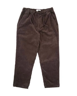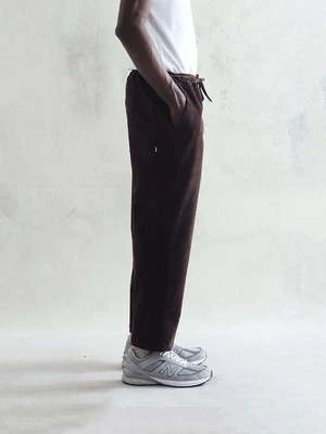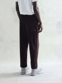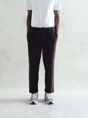 The Kurt Trouser in brown penn cord is designed to have a relaxed fit for a slightly tapered cropped leg length, featuring an elasticated drawstring for comfort, a button fastening and a concealed front opening zip.