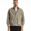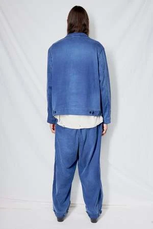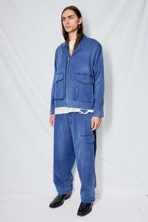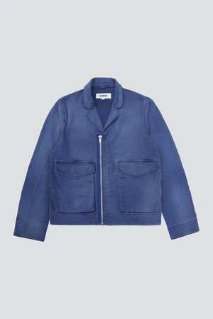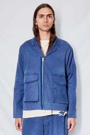 Blue Walker Washed Herringbone Twill Jacket from You Must Create. Boxy collared jacket cut in a washed French linen and cotton blend herringbone twill. Two lower front bellows patch pockets with press stud flap fastening and Revere collar. YKK zip fastening with visible tape and adjustable waist tab.